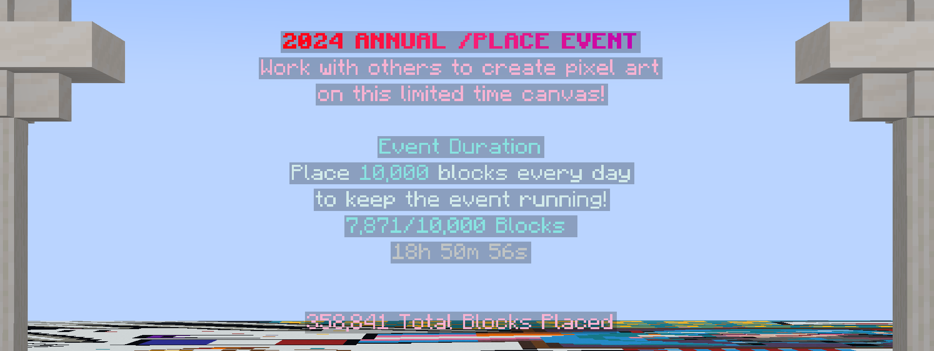 To go to place, type /place. Place was opened on September 13th 2024. There is be a daily quota of 10,000 blocks that players must meet in order to keep Place open. While at /spawn, you can view the daily quota and how long you have to meet this quota.