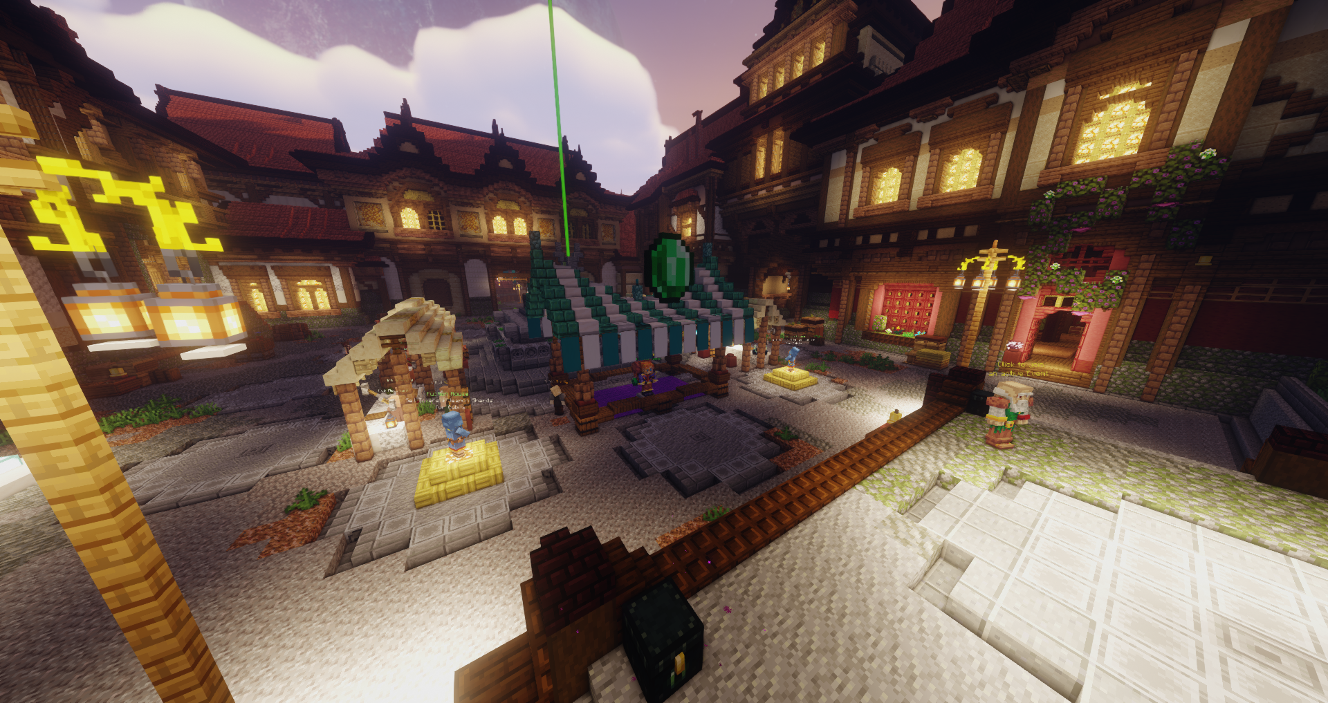 Jousting, but on pigs! Ride on pigs that travel along a fixed path up and down the arena and try to defeat your opponent before they kill you. It costs 50 emeralds to join a jousting match and the winner takes all. Interact with the lecterns or holograms near the arenas to join