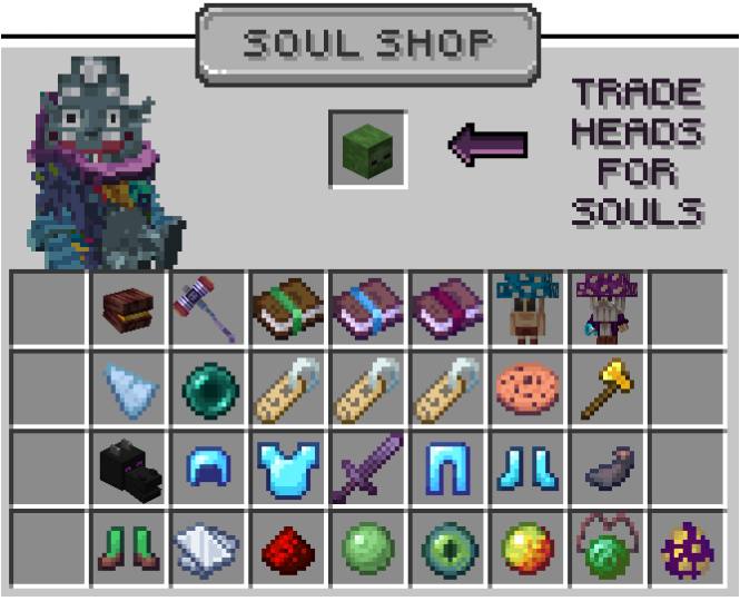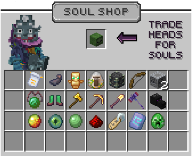 Kilton is a ruthless Monster Merchant of Manacube. Kilton uses souls as a currency rather than Money or Mana. You can collect heads by manually killing mobs where each mob has a 10% chance of dropping a mob head. Kilton will give you Souls in exchange for these mob heads. The Souls can be used in Kilton's shop.