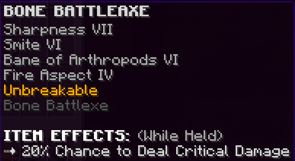 A custom axe that has Sharpness 7, Smite 6, Bane of Arthropods 6, Fire Aspect 4, and is Unbreakable. It also has a 20% chance to deal critical damage.