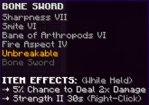 A custom sword that has Sharpness 7, Smite 6, Bane of Arthropods 6, Fire Aspect 4, and is Unbreakable. Using this sword gives a 5% chance to deal double damage, and right clicking activates a Strength 2 boost for 30 seconds.