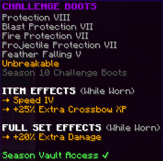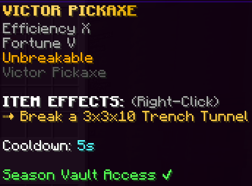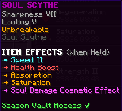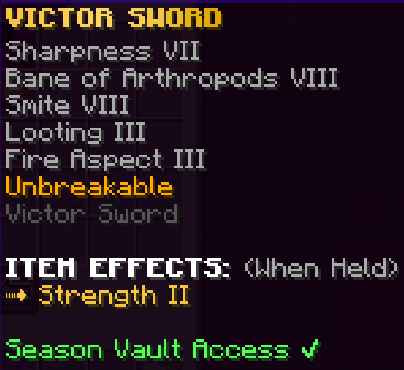 Season Vault items may be stored in /vault to be carried across server resets. They will contain the keywords “Season Vault Access” in their lore. They are found as rare prizes in various Seasonal Crates and other time-limited events.