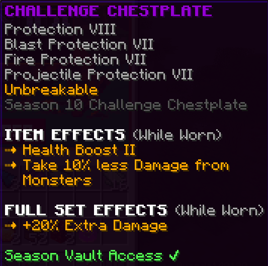The wearer of this custom chestplate gets a Health Boost 2 and takes 10% less damage from monsters.