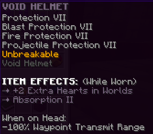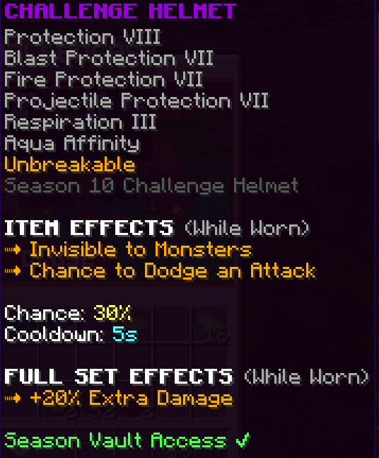 A custom helmet that has Protection 7, Projectile Protection 7, is Unbreakable, and gives a 50% chance to receive double souls from monsters.