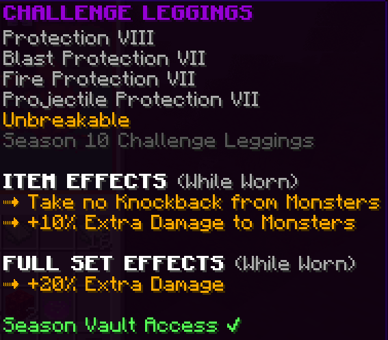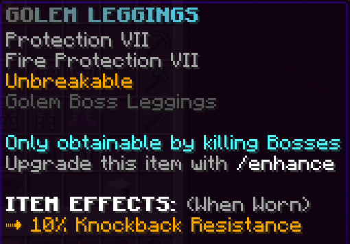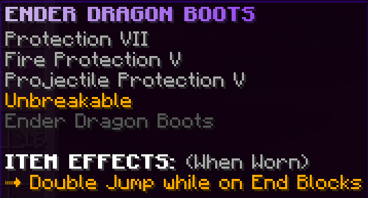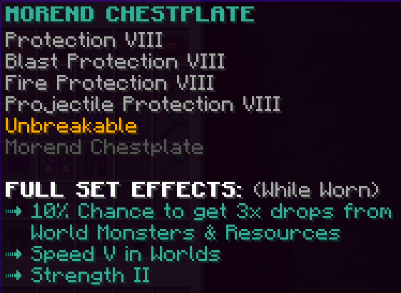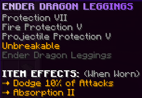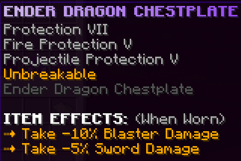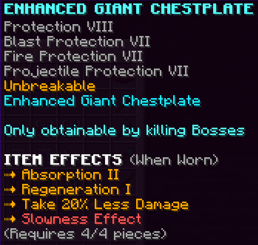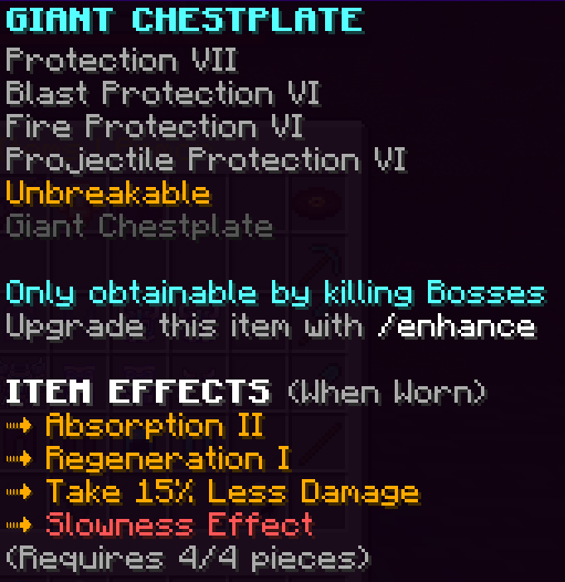All armor pieces are enchanted with Protection 8, Blast Protection 7, Fire Protection 7, Projectile Protection 7, and are Unbreakable. They have unique effects and when the full set is worn it gives a 20% damage boost.