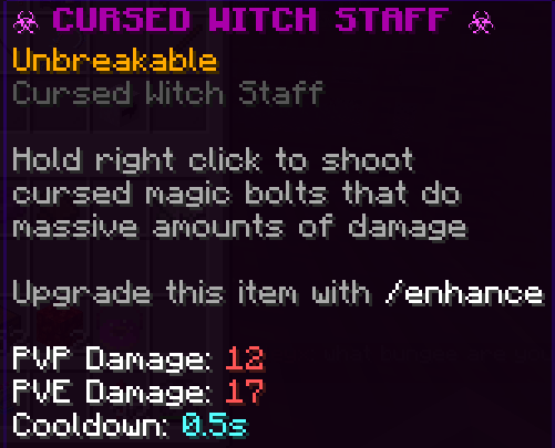 Items which are exclusively or primarily found in the Survival Worlds: Wolfhaven, Tangleroots, Sandara, Morend, Icehaven, and Burninglands. More information about each world is available with /isles. Many custom non-SVA items can be combined together to create an Enhanced version in the Item Enhancer (located next to the Enchanter in the Market, or accessed with /enhancer), where four of the same item can be exchanged for one with better enchantments and abilities.