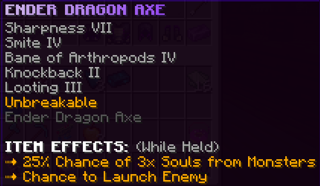 A custom axe that has Sharpness 6, Knockback 2, Looting 4, Efficiency 7, is Unbreakable, and deals 20% more damage to monsters.