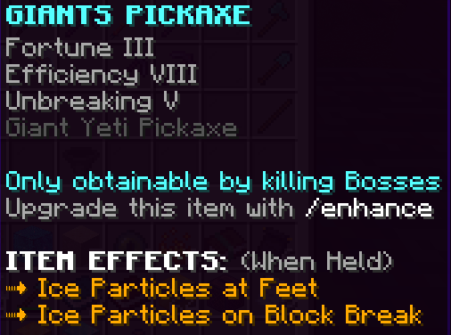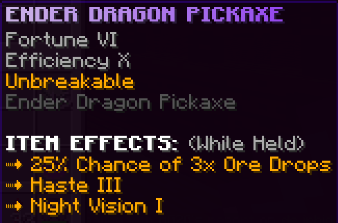 This custom pickaxe is obtained by completing all the quests in the Godly Party Quest tier. It has Efficiency 10, Fortune 5 and is Unbreakable; when held it gives Haste 2 and Speed 2.