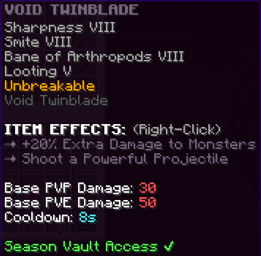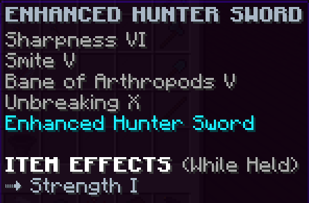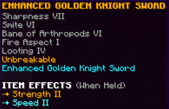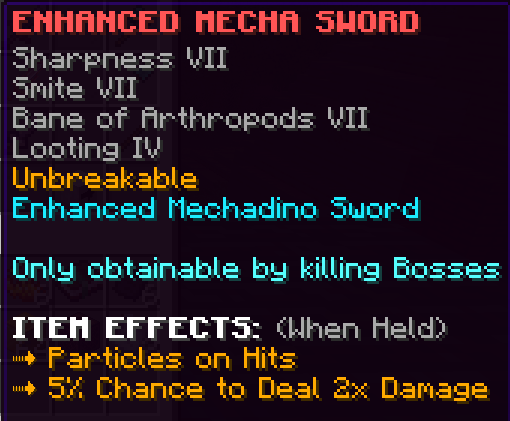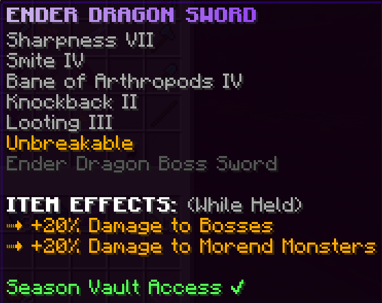 A custom sword that has Sharpness 8, Smite 7, Bane of Arthropods 7, Looting 5, and is Unbreakable. When paired with the full Challenge Armor set it gives 2 additional hearts. This sword has a damage multiplier that increases by 5% with every monster kill, but the multiplier will reset after 10 seconds with no kills.