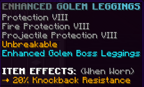 These custom leggings prevent the user from taking knockback from monsters, to whom they also deal 10% more damage.