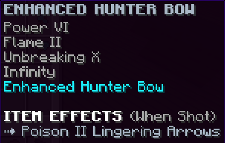 A custom bow that has Power 5, Unbreaking 5, and Infinity. Its target will be dealt Poison 2 damage and the confusion effect.