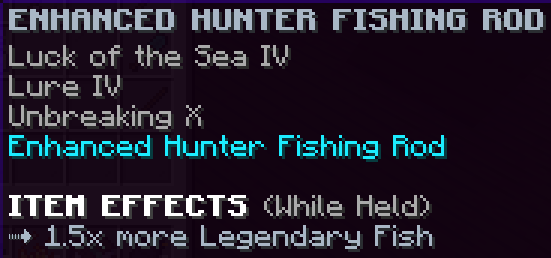 This fishing rod is obtained by completing the River Monster Party Quest. It has Luck of the Sea 4, Lure 4, and Unbreaking 10; using it gives both Night Vision and 2x more legendary fish.