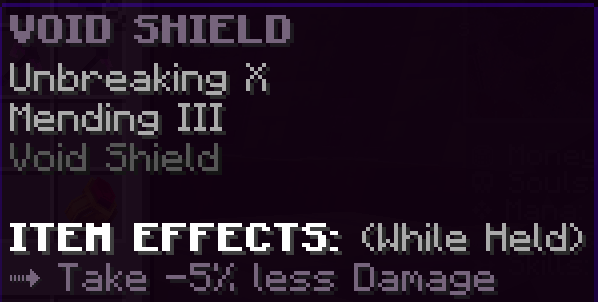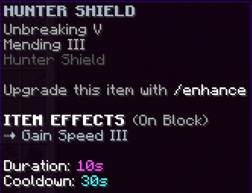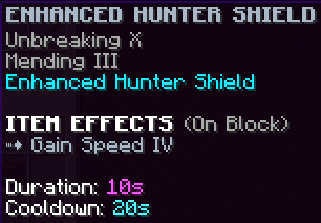 A custom shield that has Mending 3, Unbreaking 10, and negates knockback from monsters.