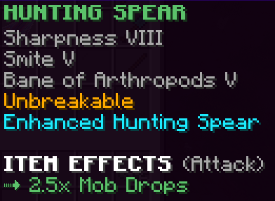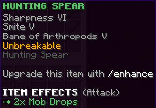 A custom weapon that has Sharpness 6, Unbreaking 6, and doubles the drops from mobs it kills.