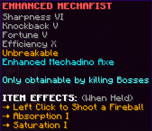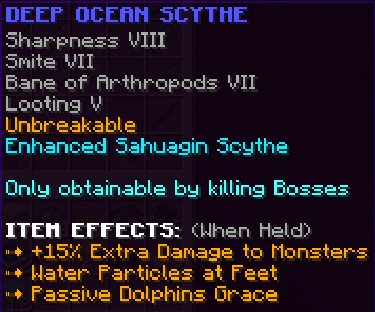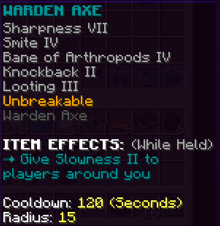 This custom axe is obtained by completing all the quests in the Godly Party Quest tier. It has Sharpness 7, Smite 5, Bane of Arthropods 5, Fire Aspect 3 and is Unbreakable. This axe deals 25% more damage to bosses and holding it gives 15% Knockback resistance.