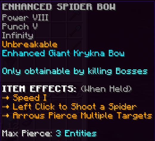 A custom bow that has Flame, Infinity, Power 5, and is Unbreakable. It can shoot poisonous mushrooms and gives Jump Boost 2 when held.