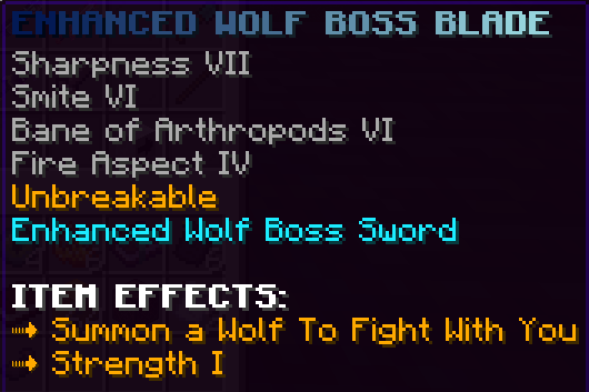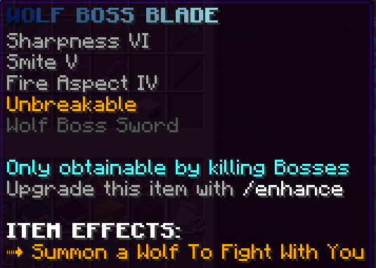 A custom sword that has Sharpness 8, Smite 5, Looting 4, and is Unbreakable. It has a Fang Attack ability to damage monsters within its radius.