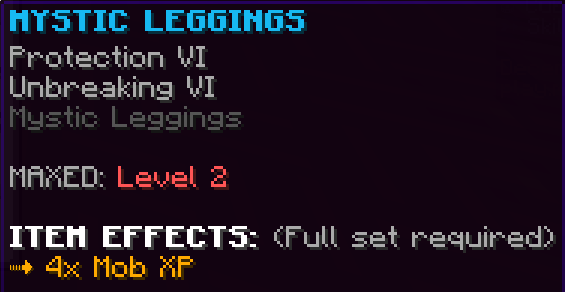 Custom leggings that increase the amount of EXP the wearer earns by 20%, and gives them a 20% chance to get double heads from mobs.