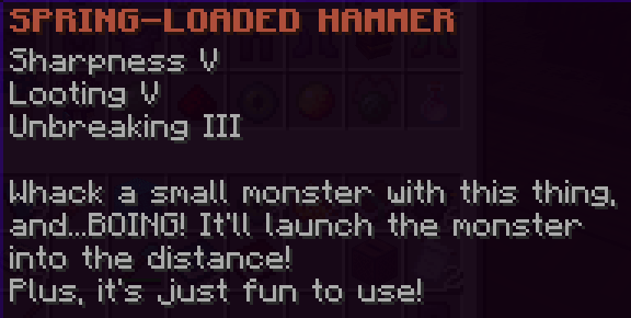 A custom mace that has Wind Burst 3, Density 5, Breach 4, and Unbreaking 5. It has the ability to launch enemies in the air every five seconds.