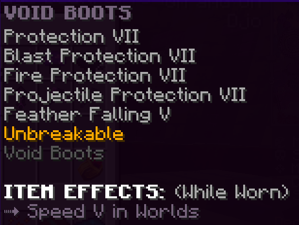 Custom boots that have Protection 6, Projectile Protection 6, Feather Falling 3, Unbreaking 7, and are Unbreakable. They give the wearer Jump Boost 4 in Tangleroots.