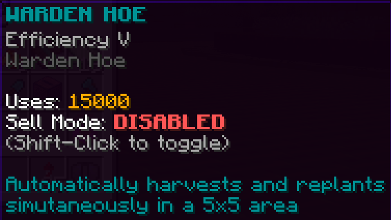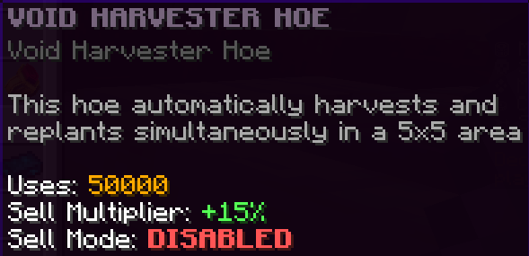 This custom 5x5 harvester hoe has 100,000 uses and a 25% sell boost.