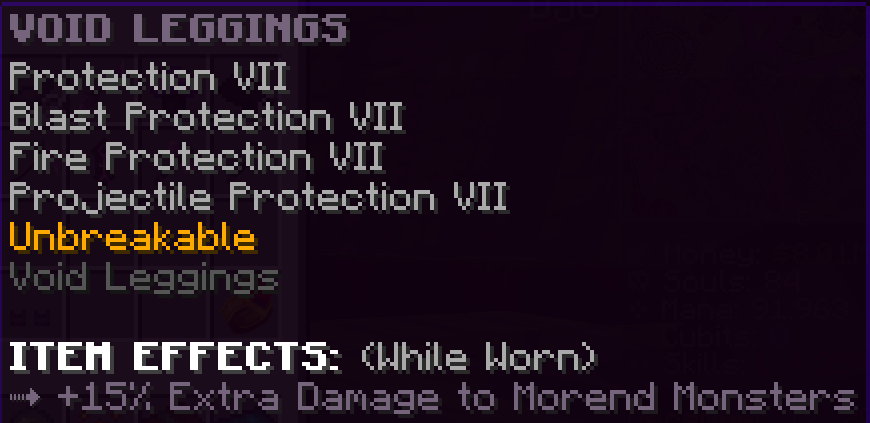 A custom set of armor that has Protection 9, Projectile Protection 9, and is Unbreakable. Every piece has a unique effect, and wearing the full set gives both Regeneration 2 in Tangleroots and triple souls from Tangleroot monsters.