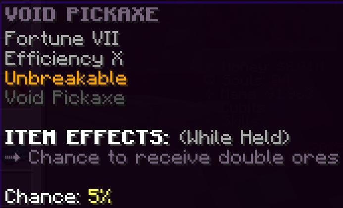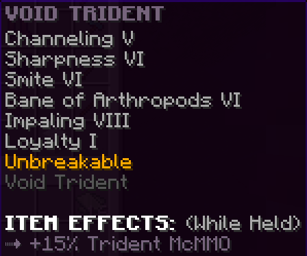 A custom pickaxe that has Fortune 5, Efficiency 8, and is Unbreakable. Mining with this pickaxe gives 15% more McMMO xp.