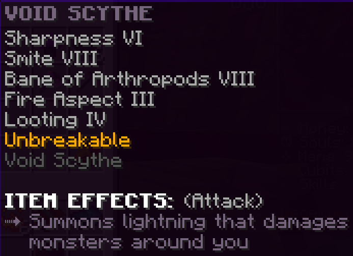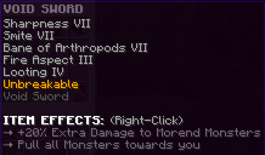 A custom sword that has Looting 3, Mending, Sharpness 5, Smite 5, and Unbreaking 7 that gives bonus mana from killing monsters.