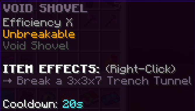A custom trench pickaxe that has Fortune 4, Efficiency 10, and is Unbreakable. Every 30 seconds it can mine a 5x5x5 tunnel.