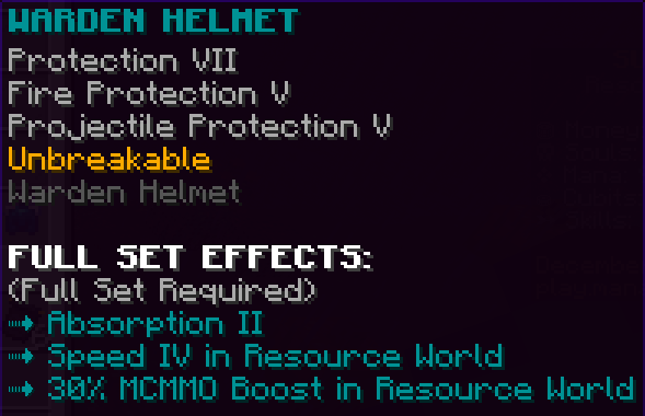 A set of enchanted diamond armor dropped by Mini Mana Golems, found in Wolfhaven mines. Each armor piece has Protection 5 and Unbreaking 5, and wearing the full set gives a Speed 2 effect.