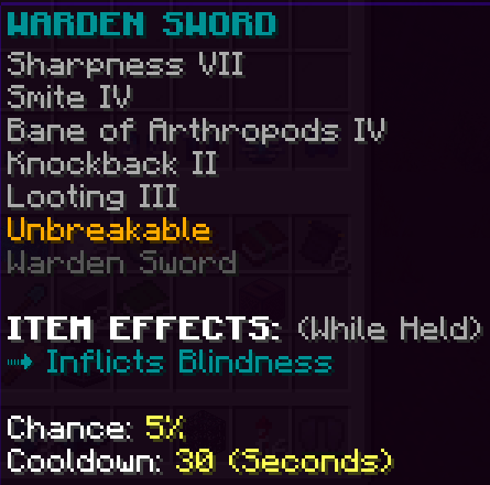 A custom sword that has Sharpness 4 and Unbreaking 5 and gives Strength 2 and Mining Fatigue 2 while holding.