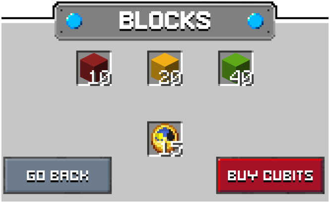 You can purchase 10 Bonus blocks for 2 cubit, 20 Bonus blocks for 3 cubits and 40 Bonus blocks for 5 cubits. Additionally there are two cooldown packages that you can purchase. There is the Premium Cooldown that will lower your cooldown to 15 seconds, ignoring your rank cooldown. The Premium Cooldown costs 15 cubits and is a one-time purchase. The Temporary Ultimate Cooldown will temporarily lower your cooldown to 10 seconds for 1 hour. The Temporary Ultimate Cooldown costs 5 cubits and can be purchased multiple times.