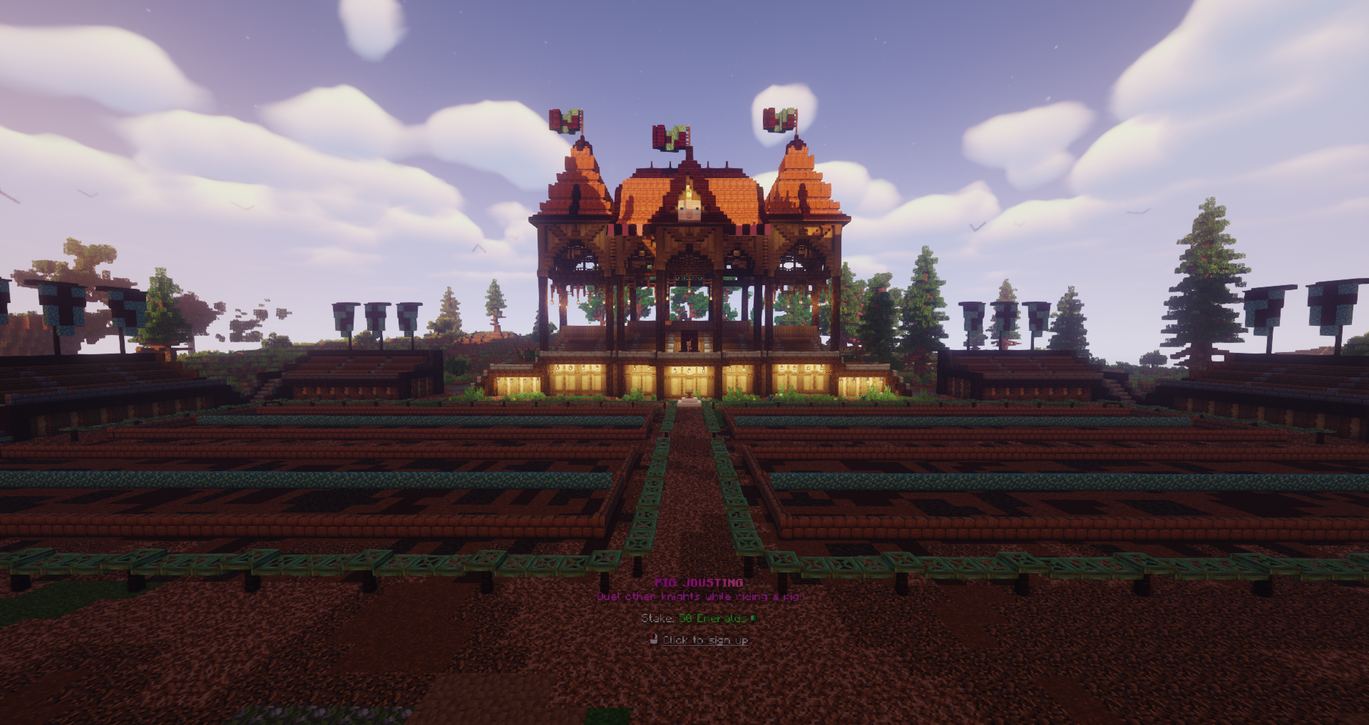 Jousting, but on pigs! Ride on pigs that travel along a fixed path up and down the arena and try to defeat your opponent before they kill you. It costs 50 emeralds to join a jousting match and the winner takes all. Interact with the lecterns or holograms near the arenas to join