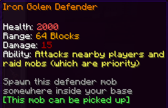 The Iron Golem Defender mob will attack nearby players and raid mobs. You can buy this Defender mob from /kilton or win it from the Loot /crates.