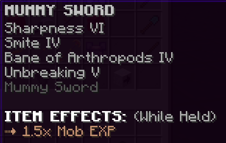A custom sword that has Sharpness 7, Fire Aspect 4, Looting 6, and is Unbreakable. Mobs killed using this sword give double drops and EXP.