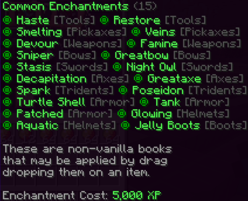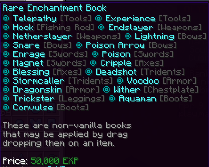 Common books can be bought at the price of 5,000 XP, Uncommon at 50,000 XP and Rare at 200,000 XP. Upon buying a book, you will need to right click it to reveal a random enchant in the specific category you have bought. You may read about any specific custom enchantment by doing /enchant [name].