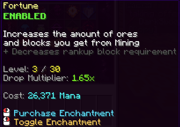Most enchantments bought for your pickaxe cost Mana. To get the popup menu, right click your pickaxe! To toggle an enchantment on/off, you can right click or shift + right click on it in the GUI.